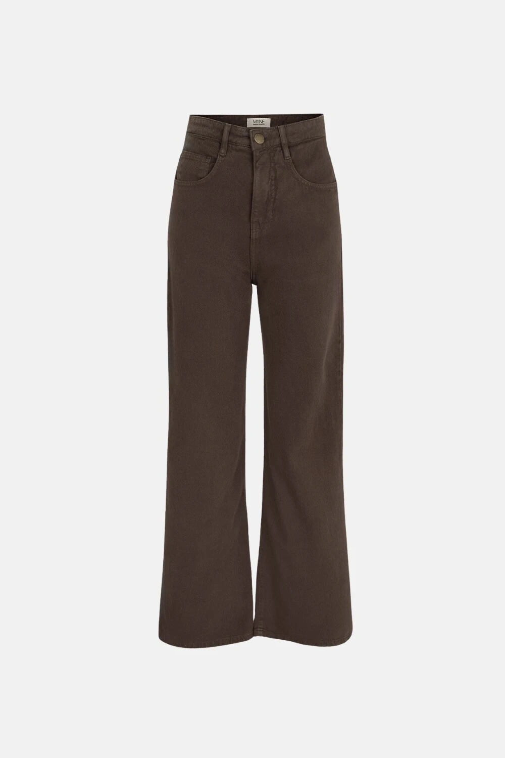 A Calça Sarja Wide Leg é confeccionada em sarja 100% algodão. A modelagem é clássica de wide leg, ajustada na cintura e ampla no comprimento. Possui cintura alta, bolsos frontais e traseiros no próprio tecido e a barra é feita. O cós tem passantes aplicados. A cor é uniforme, sem marcações. O fechamento é frontal com zíper de metal e botão personalizado MYNE no banho de ouro velho.