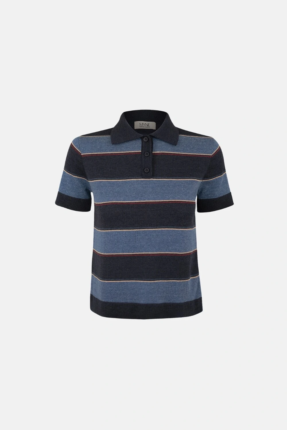 A Blusa Polo Tricot Listrada é confeccionada em fio de tricot, sendo 38% algodão, 38% acrílico, 22% poliéster e 2% elastano. A modelagem é ampla, com caimento reto. Possui gola estilo polo na cor azul, com vista funcional aplicada e três botões de acrílico com efeito tartaruga. As mangas são curtas e comprimento é abaixo da cintura.
